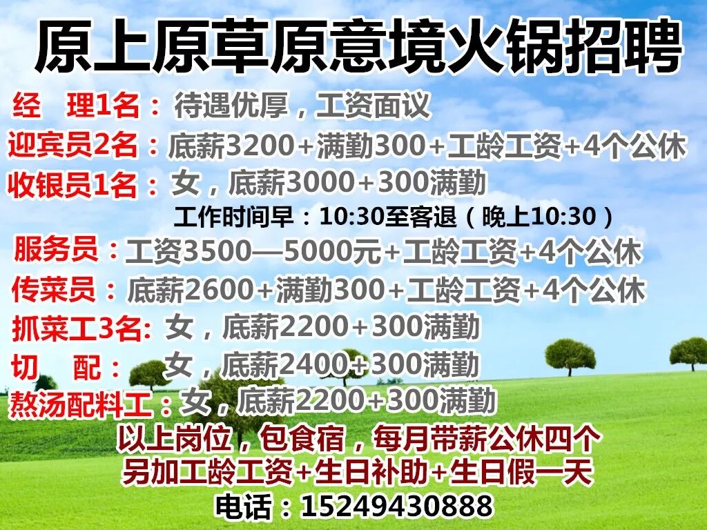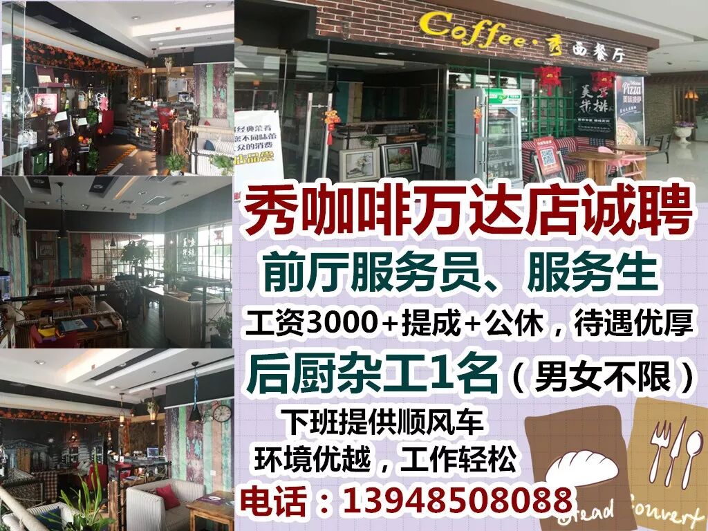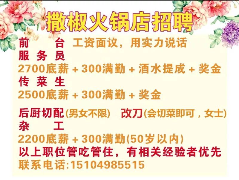 大堂经理1名:要求三年以上管理经验沟通能力强,能带动店内客源
