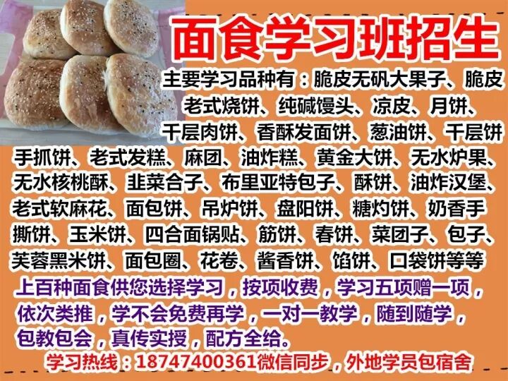 主要学习品种有:脆皮无矾大果子、脆皮、老式烧饼、煎饼、纯碱馒头、凉皮、月饼、千层肉饼、香酥发面饼、葱油饼、千层饼、手抓饼、老式发糕、麻团、油炸糕、黄金大饼、无水炉果、无水核桃酥、韭菜合子、布里亚特包子、酥饼、油炸汉堡、老式软麻花、面包饼、吊炉饼、盘阳饼、糖灼饼、奶香手撕饼、玉米饼、四合面锅贴、筋饼、春饼、菜团子、包子、芙蓉饼、黑米饼、面包圈、花卷、酱香饼、馅饼、口袋饼等等上百种面食供您选择学习,按项收费,学习五项赠一项,依次类推,学不会免费再学,一对一教学,随到随学,包教包会,真传实授。