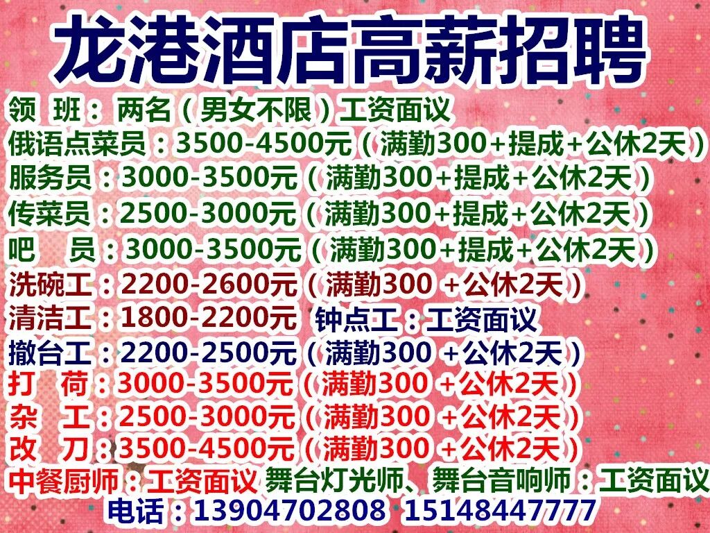 传菜员若干名:工资2600加满勤200(有菜梯)