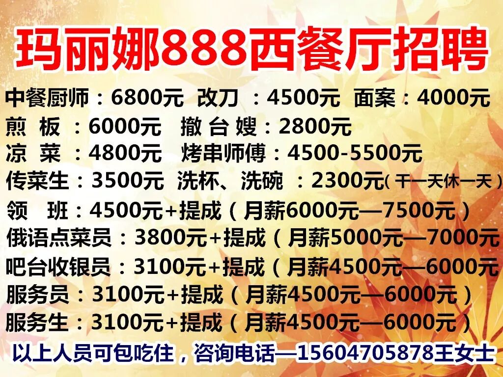 餐厅服务员10名,工资2800+满勤+2天带薪休息