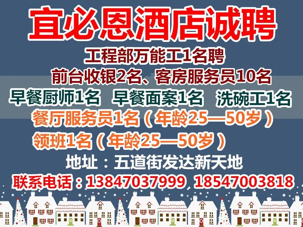 总台服务员4名,工资2500+满勤+2天带薪休息