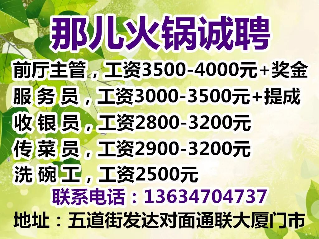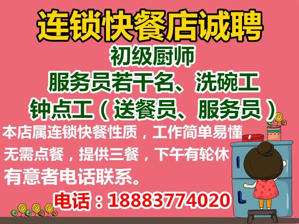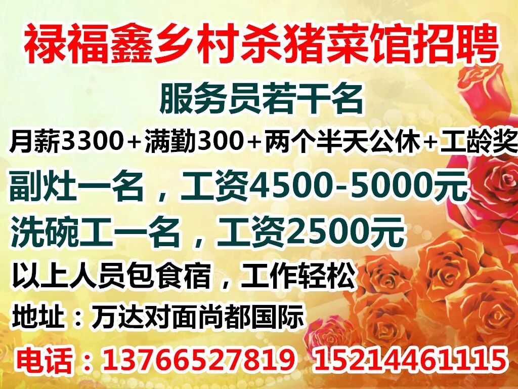 传菜员若干名:工资2800+满勤200(有菜梯)