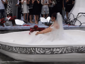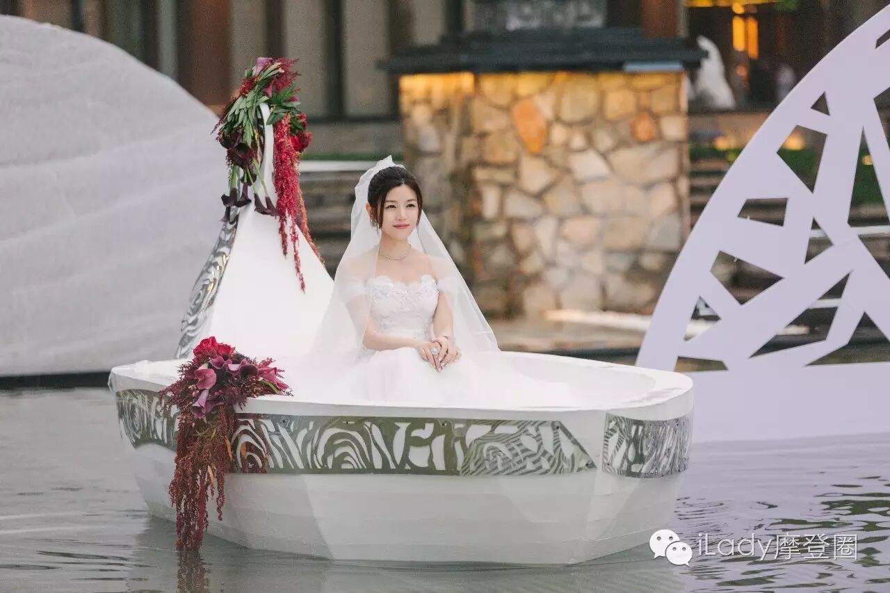 婚礼现场除了有唯美的玫瑰花海,还布置了独角兽等塑像,很是梦幻。由干冰制造出烟雾缭绕的效果,宛如仙境。而新娘的出场方式也很有意思,乘坐小船缓缓现身,上演了真人版的童话故事。