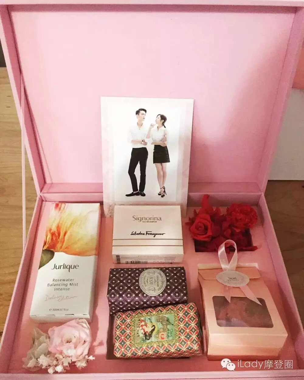 伴手礼也是非常丰富的,包括了茱莉蔻玫瑰衡肤花卉水沁润限量版、菲拉格慕伊人香水、Claus Porto经典系列香氛皂和MS PREtea Delight为婚礼定制的纯天然玫瑰开心果花朵饼干。