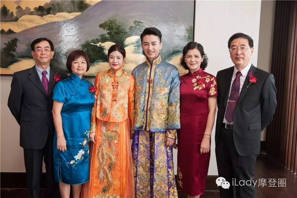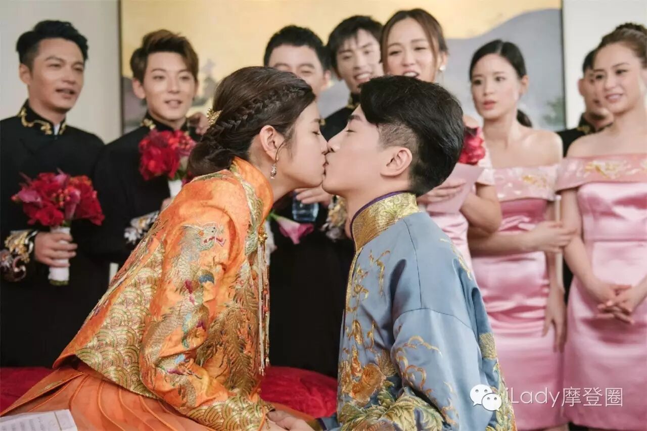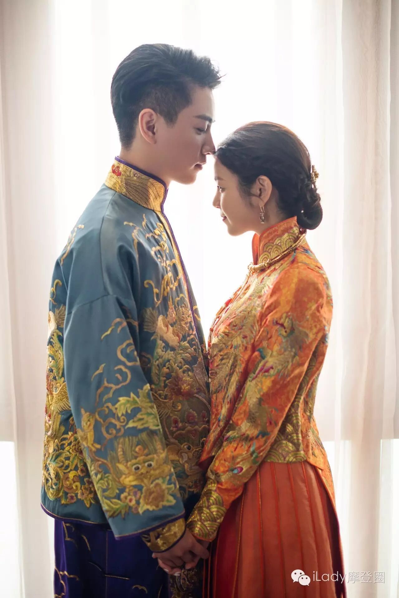两位新人的中式礼服均来自郭培•玫瑰坊高级定制,陈妍希身穿橘色凤彩裙褂,运用了独特的平金撵绣手法,耗时1880小时制作完成,而陈晓穿着的是瑞兽紫金袍,由珍贵稀有的彩色金线缝制,耗时高达3985小时,其中的立体刺绣寓意着幸福吉祥。
