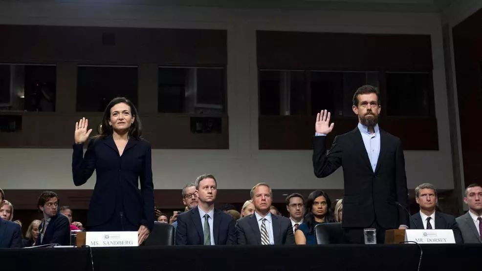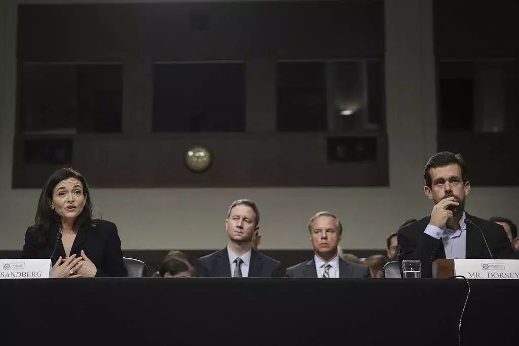 Facebook COO谢丽尔·桑德伯格、Twitter联合创始人兼CEO杰克·多西(Jack Dorsey)出席了听证会,并回答议员们的提问。
