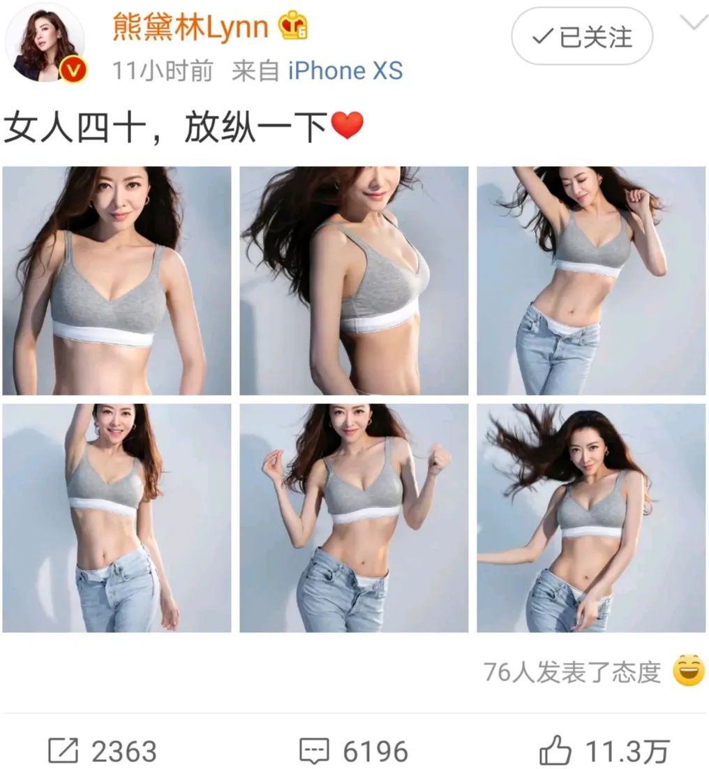 今日凌晨,熊黛林在微博晒出一组性感写真,并配文“女人四十,放纵一下”,庆祝自己的40岁生日: