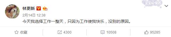 林更新说今天选择工作一整天,因为“工作使我快乐”。