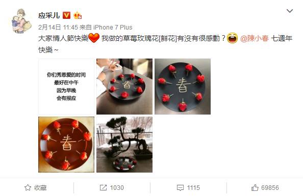应采儿和陈小春继续恩爱,应采儿秀了自己做的草莓玫瑰花。今天也是他们的结婚纪念日,已经七年了