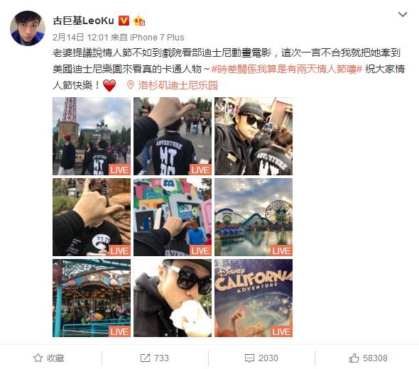 另外还有一位宠妻狂魔选手古巨基,说老婆情人节想看迪士尼电影,他就把老婆带到美国迪士尼去过节