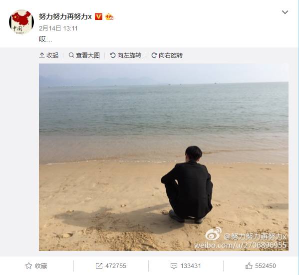 张艺兴发了个微博,一个人在海边孤独的背影,配了一个“哎…”