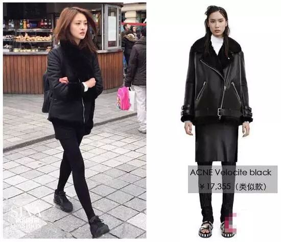 郑爽穿ACNE黑色皮夹克