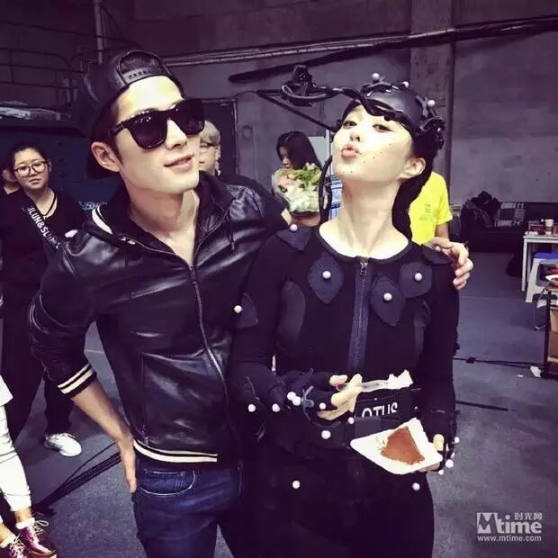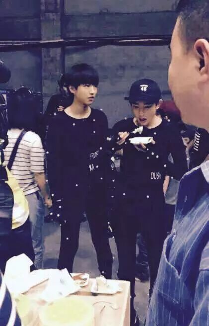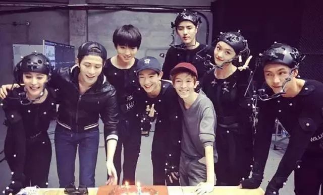 在拍摄现场,王俊凯、王源已换好动作捕捉服装,看照片应该是拍摄间歇时间,两人正在吃剧组拿来的蛋糕,而现场除了两小只外,范冰冰、吴亦凡、陈学冬也在身旁,大家一同有说有笑。