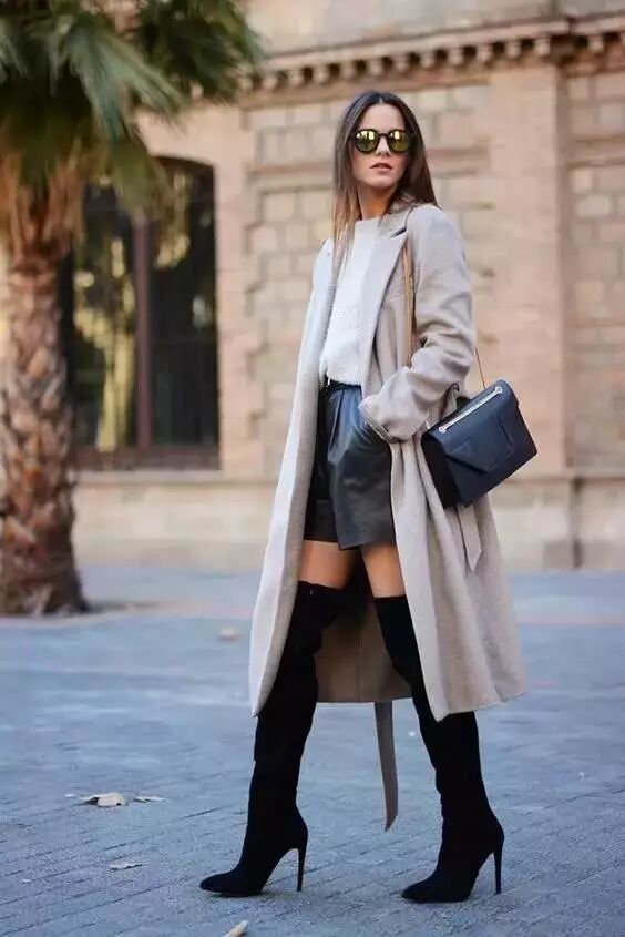 太冷的话,还可以搭上一件长外套。灰色长大衣与黑色皮短裤相得益彰。