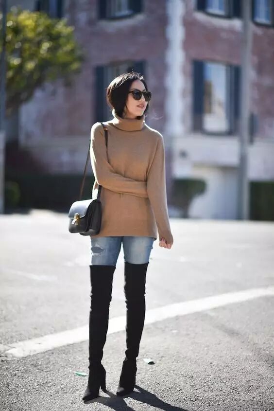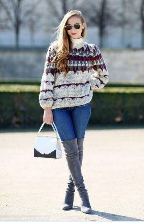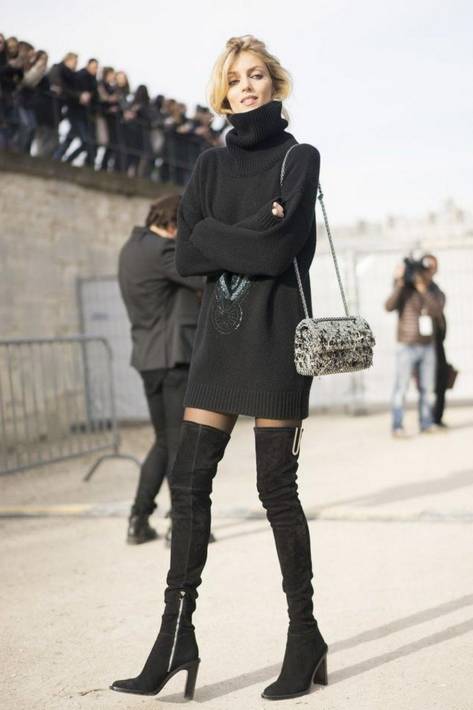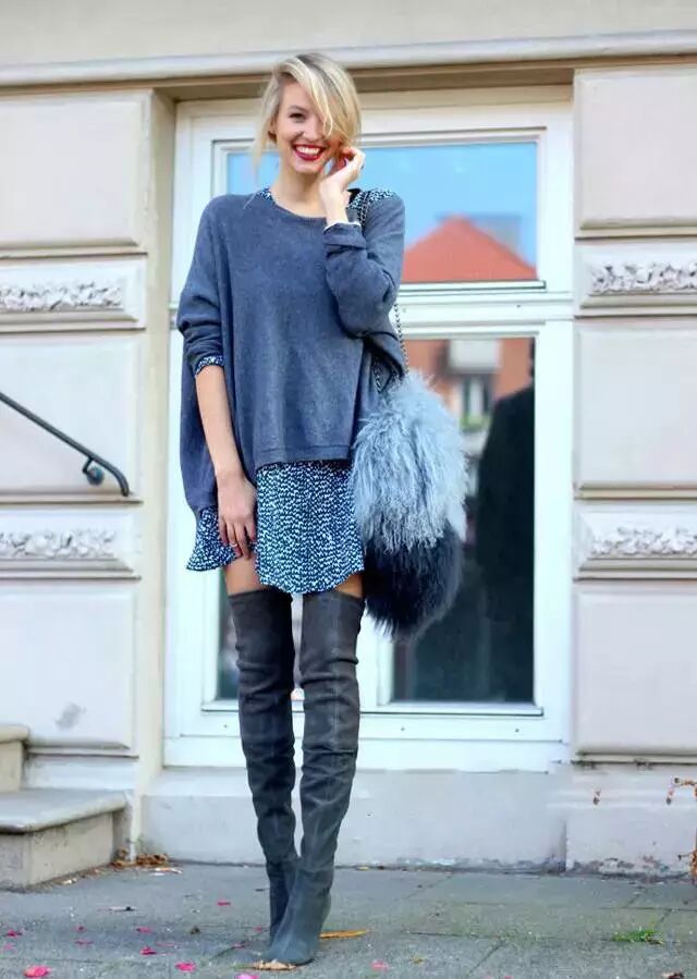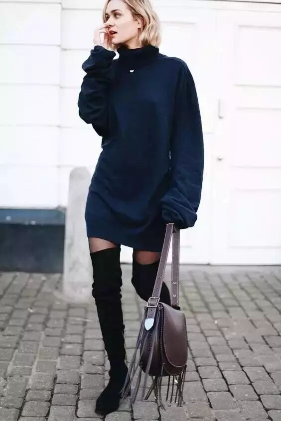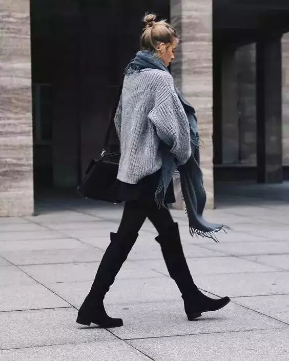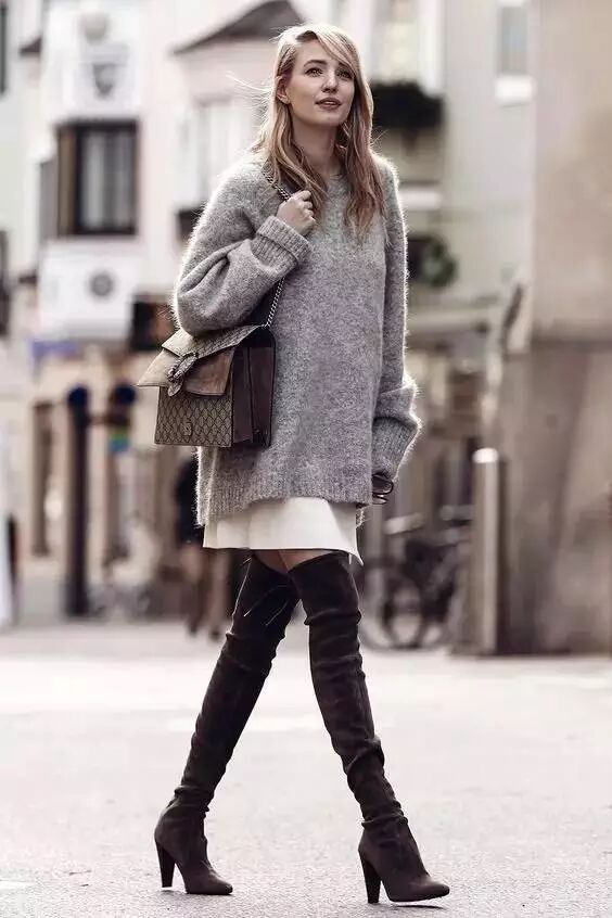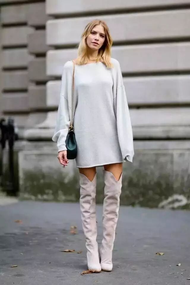 穿过膝靴,不仅在于拉长腿部线条和比例,更在于要露腿!因此,大毛衣是首选!毛衣搭配过膝靴,不仅可以温暖腿部,还可以拉长腿型,一举两得!