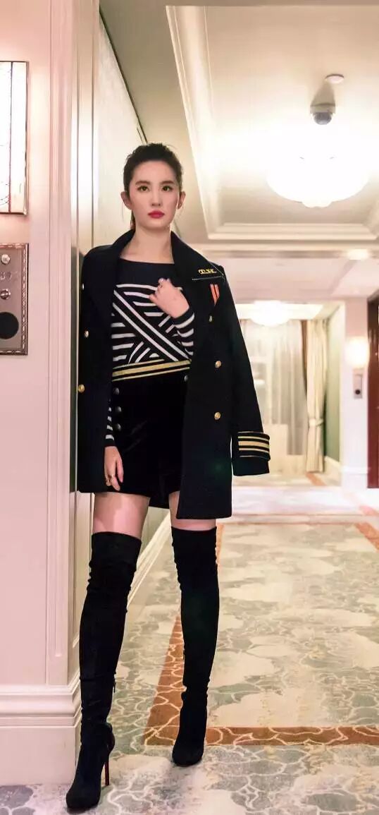 刘亦菲的黑色丝绒短裤加过膝靴,虽然一身黑色,但是大腿的一点点留白,委婉性感!