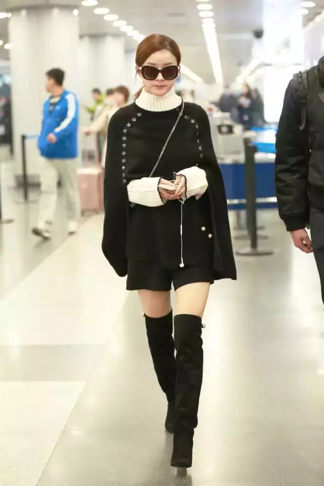 赵丽颖黑色短裤搭配羊毛斗篷外套和高领毛衣,脚踩麂皮高跟过膝长靴,有名媛范儿!