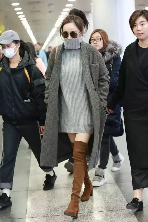 大幂幂示范了过膝靴加上装的造型,最能达成视觉上显瘦效果。
