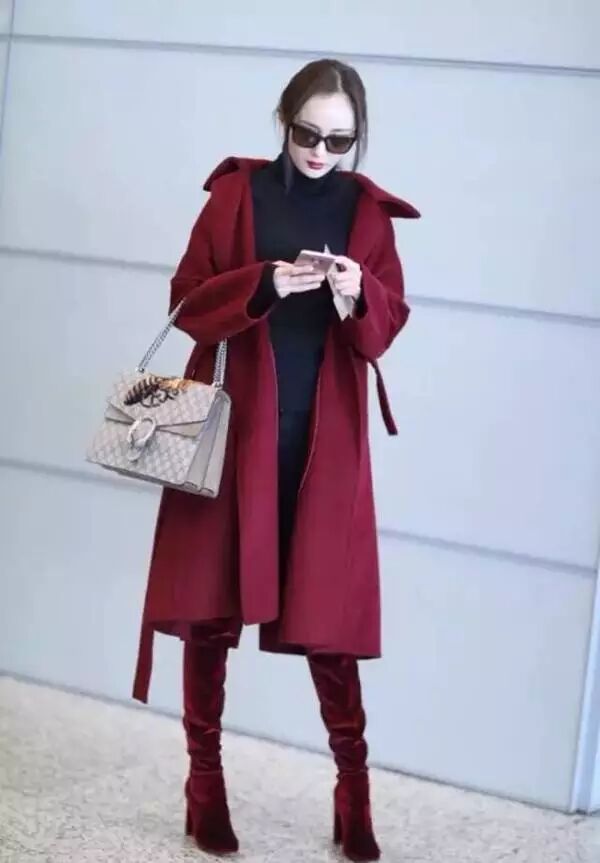暗色的毛衣可以像大幂幂一样搭配这种亮色丝绒长靴,打破沉闷感。