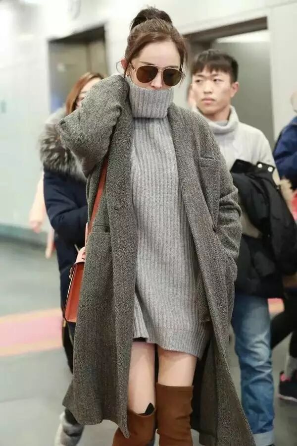 贴士:穿长靴时露出来的那段大腿不能太肉。严重的梨形身材的MM建议选择的毛衣裙边更长些,能与靴子相切。这样保暖性更强,修饰身形的效果更好!