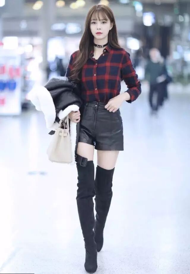 沈梦辰的过膝靴搭配皮革短裤,玩转高瘦小心机。