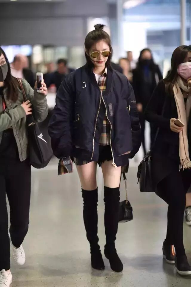 袁姗姗的牛仔短裤搭配黑色飞行员夹克和超长过膝靴,引领摩登新风尚!