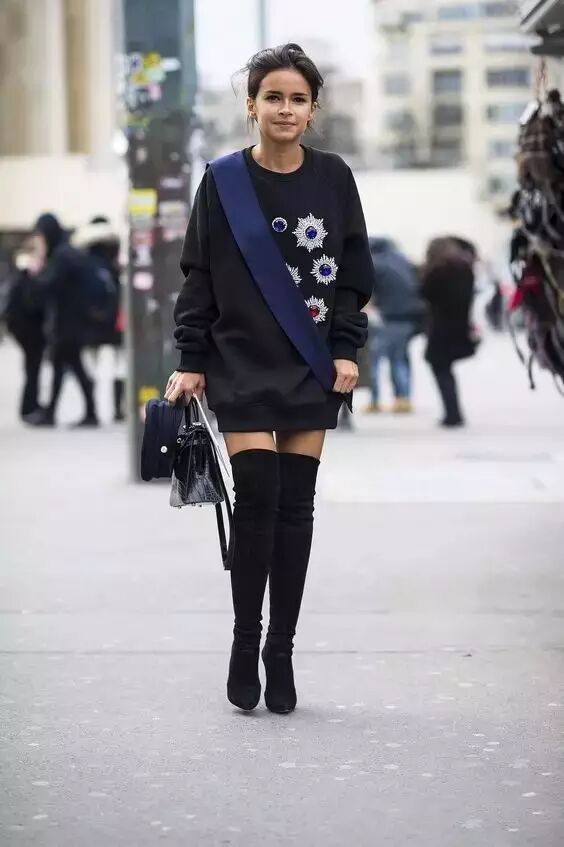 俄罗斯的小个子名媛米洛斯拉瓦也是同样的搭配思路,细高跟过膝靴加卫衣,显得修长又时髦。