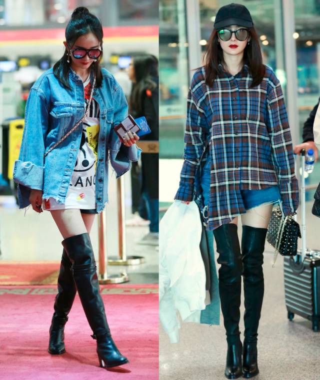大幂幂真的很爱长靴啊!牛仔外套和格子衬衫减龄,短裤和T恤拉长身形!