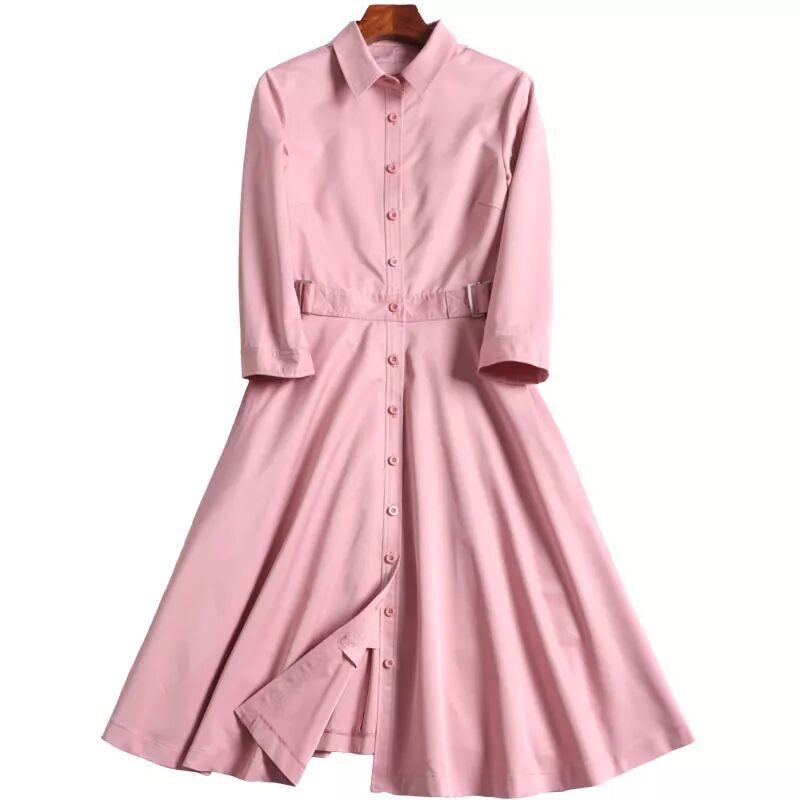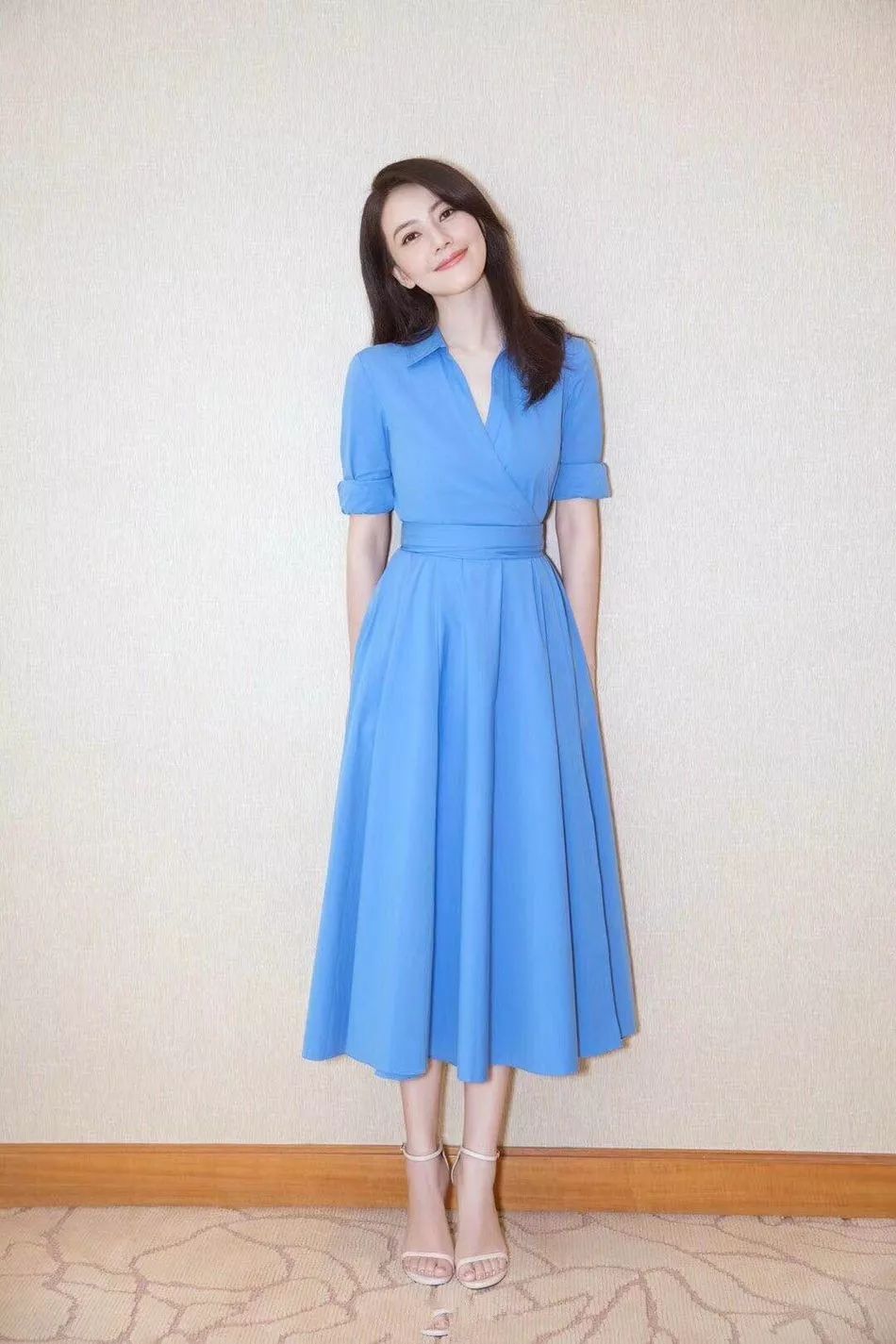 首先来一波圆圆女神的纯色连衣裙吧!还有比清清爽爽的蓝色更适合春夏时节的吗?衬衫领+百褶裙的经典样式,几乎不会挑人,通勤or出街都超合适。