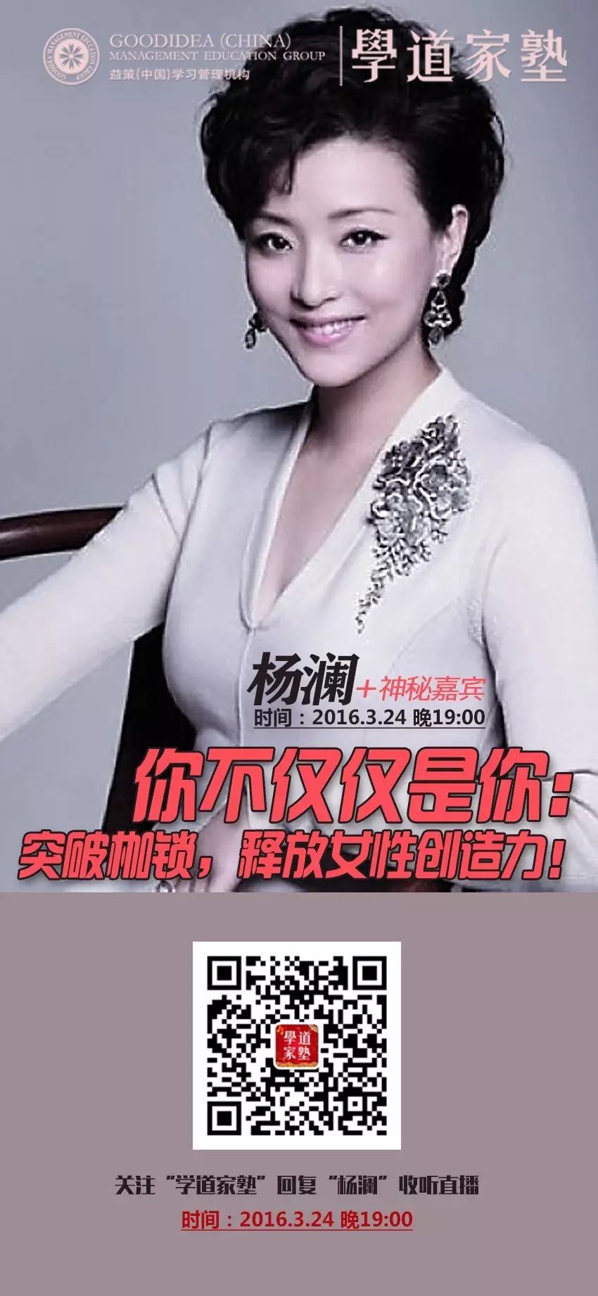 今晚,天下女人国际论坛的创始人杨澜将做“你不仅仅是你:突破枷锁,释放女性创造力”的主题分享,收听回复关键字:杨澜
