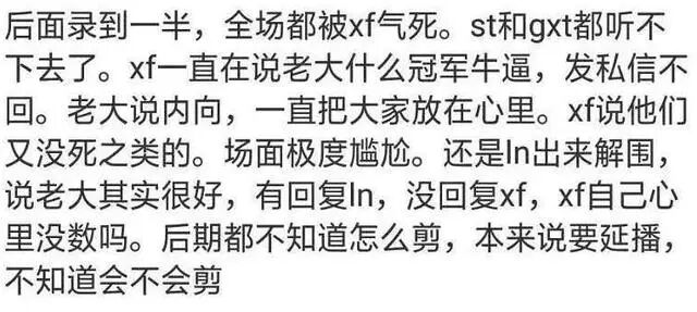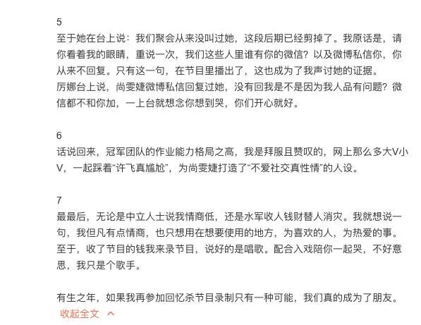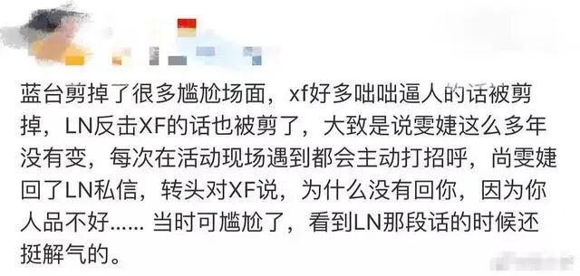许飞手撕尚雯婕,厉娜韩真真怒怼,06超女重聚,多年恩怨大爆发? 亲爱嘀 内地女星 2020-04-09 15:30:37 1197 创作不易,用心坚持,欢迎请BaGua喝几杯爱心咖啡!打赏并支持本文 打赏并删除本文 这一次《王牌对王牌》重聚梗彻底玩崩了。观众们看到了活生生的现场撕逼,热搜几乎挤爆。本来好好的06超女重聚,因为许飞对尚雯婕的声讨,让现场的氛围变得非常的尴尬,几个人差点要因此而吵了起来,还好沈腾贾玲的救场以及后期的剪辑,才让画面看起来稍微和谐了一些。本以为此事就此了结了,没想到许飞却突然又在微博站出来发声,台上没有吵够的架,台下又开始继续撕了起来。这究竟是怎么回事?酒窝姐带你一探究竟。1其实节目一开始,就是固定流程,06年重聚的超女大家一起合唱主题曲。注意看许飞的表情,这个时候她就已经格格不入,两手插兜。唱完尚雯婕去拥抱许飞,许飞两只手更是尴尬的停在空中,脸上表情变换万千。唱完了大家开始诉衷情,但是唐笑和许飞一张嘴就透露她们跟尚雯婕失联很久了。唐笑说,已经很久约不到尚雯婕了。许飞接着这个话题就说,其实微博私信过尚雯婕,但是她一直没有回复。许飞说大家一起走过的路、一起看过的风景,很多年后再看是很宝贵的,并当面质问尚雯婕:“你为什么把我们弄丢呢?”场面一度尴尬得不行。尚雯婕的解释是微博私信她真的不怎么看。同场的厉娜主动说要替尚雯婕说话,认为尚雯婕在当年比赛的时候就比较内向,不爱聊天,又很努力,觉得现在的尚雯婕其实和当年一样,没有改变。许飞又提到,不知道为什么尚雯婕要一直把自己包裹起来,认为没有必要。尚雯婕则表示,06年,超女伙伴们是向着同一个目标进军过的人,是有过共情的人,只是自己不喜欢经常把共情的点拿出来在不够珍贵的场合去分享。沈腾、贾玲也只能出来打圆场,说尚雯婕是个很酷的人,但是感人的是,她在现场蹲在那里哭了。镜头快速的剪辑而过,毕竟主持人在努力救场,所以基本上大家看到的充满火药味的互撕就在这里结束了。然而压根就没完。许飞录制完节目后,发表了长文直接开撕尚雯婕:指责尚雯婕拿到冠军之后,就和自己没有私下交集了,有过几次工作交集许飞向尚雯婕索要微信都被她拒绝了,暗指她红了之后耍大牌不联系,明明就和大家不熟,还在台上和大家装亲热,想念到哭。许飞在文中提到说,自己曾拒绝节目邀请,因为跟尚雯婕并不熟,说尚雯婕拿到冠军后就没有再出现过在自己的工作里,工作中遇见几次,尚雯婕都说忘带手机无法加微信。许飞评价说:“大概不是觉得手机不配,就是觉得我不配。”火药味十足,算是正面开撕尚雯婕了。她还说明,最终答应录制节目,就是为了劳务费,言下之意,不是为了什么友情。许飞透露说节目组已经做了很多删减,她之所以当面怼尚雯婕,是因为现场尚雯婕蹲在地上哭,说看到大家很感动,这么多年聚会从来没叫她,许飞认为“台下我们明明形同陌路,怎么一上台就感情这么好了?”有参与过现场录制的网友发文说,其实现场更加激烈,许飞很多咄咄逼人的话都已经剪掉。尚雯婕说自己内向,一直把大家放在心里,许飞又说他们又没死,场面极度尴尬。所以,06年超女的观众很悲哀的发现,自己怀念的超女根本不是一个团体,唐笑和许飞先发制人,厉娜是支持尚雯婕的,而胖得完全走形了的韩真真,看上去和尚雯婕关系也不错。当年一起“想唱就唱、唱得响亮”的女孩们,早就已经四分五裂。2其实2006年之后,超女们发展各有不同,也很难说互相还能帮衬和合作。相比较而言,许飞热度较低,而尚雯婕则风生水起,还自己做了老板签新人,对比相当明显。当然,尚雯婕那堪比lady gaga的造型和不断整容变脸,也是话题不断。06超女的开撕大戏,上演了也不止这一次,早年间尚雯婕和谭维维还亲自下场互怼。尚雯婕和谭维维同为06年的超女,尚是冠军,谭是亚军。比赛之后谭维维出了一首歌叫《谭某某》,歌词中说冠军样样不如自己。歌词可谓是非常露骨了。对于这首歌引发的争议,尚雯婕选择了低调的忍受。后来有人采访过她,尚雯婕说,发歌之前谭维维就歌词的内容和她打过招呼。谭维维后面在不同场合也提到过“谭某某”这首歌引发的争议,说自己反省过此举对尚雯婕造成的伤害。因为当时谭维维处于事业的低谷期,好友高晓松想要帮她制造话题,所以担纲写了这首歌的歌词。在这首歌拿比赛结果和两个女孩之间的关系开涮的时候,实际上每个人就已经走进了一个漩涡——公众人物的一言一行,哪怕不是出自自己的本心,歌词里怎么写,然后经过了大众传播,不明真相的观众也会认为,那就是你的心声。相比尚雯婕和谭维维还多次对媒体解释和维护对方,许飞和厉娜的关系更是成谜。比赛期间,这两人可是一对要好的cp啊。漂亮的厉娜和酷酷的许飞,也一直是互相支持打气的好姐妹。06年,许飞淘汰止步五强时,厉娜就被媒体拍到情绪低落。而就在下一场比赛,厉娜马上被淘汰了。本来一对好CP,散了疑似是因为“雪藏事件”,2012年厉娜上节目谈到自己被公司雪藏,说08年公司换高层后自己就几乎没什么通告了,公司甚至会主动推掉找她的工作。厉娜称,自己被雪藏除了是合约问题,还有比赛时关系很好的朋友在背后插刀。“那个人”不止一次地跑到公司高层面前说自己坏话。因为实在受不了这种是非,于是她就决定远离这个朋友。2014年就