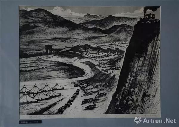 《移山造海》以鸟瞰式的全景构图展现了十三陵水库工地的全貌。版画不大场面大,在黑白对比中,已富有组织和韵律的刻线,形成了灰色调过渡。飘动的红旗、白色的帐篷、运送石料的车队和挑着沙土的人流尽收眼底,不禁令人回顾那跃进的时代和青春的年华。