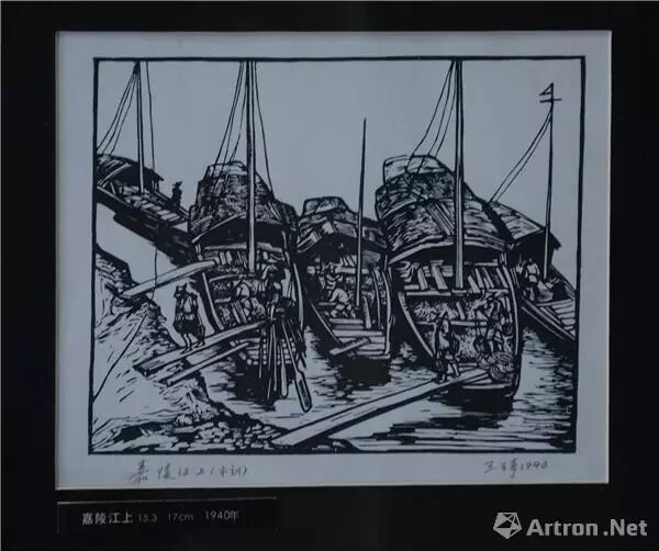 《嘉陵江上》所刻的是几只停泊在江畔的小船装煤运煤的情景。这幅作品曾展出于1942年在莫斯科举办的“中国抗战木刻作品展览会”,并博得艺术评论家苏沃洛夫的好评。他说:“一群小船,弦门,水——这一切都是用明确和富有表现力的影绘来构成的。这又是一个歌颂人类劳动的主题。”它,不刻背景,力避繁冗。在所刻五只小船中,尤以左右两只更具装饰情味,刀法也较为简洁。而更加难得能可贵的,则是整个画面呈现着一种地域特色,颇为耐人寻味。