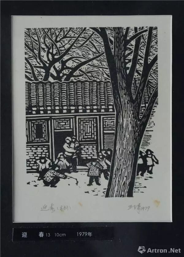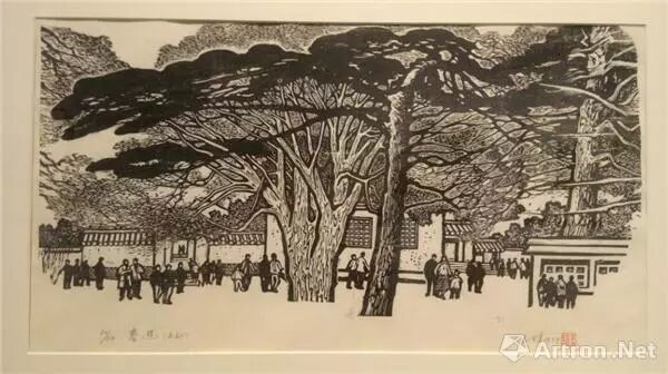 《春游》用圆口刀加三角刀刻制,刀法刚劲娴熟。黑白灰的大胆运用使画面节奏明快。画幅采用了宽银幕式的构图。劲直挺拔的古松,配置以开放的伞形树冠和水平线式的院落,给人以向上、开阔、生机勃勃的感觉。作品创作于1979年,正是打到“四人帮”后拨乱反正、百废俱兴的念头,王琦对新的生活充满喜悦和希望。