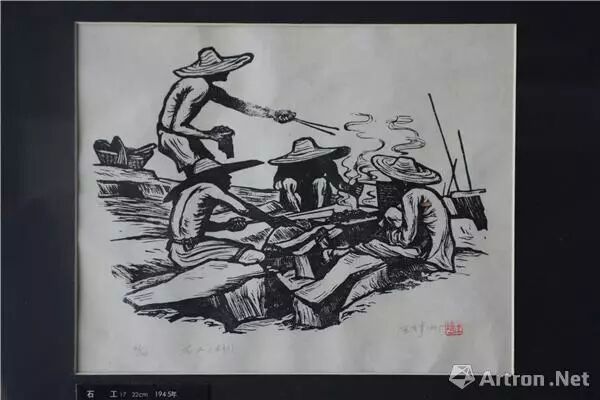 《石工》曾发表于美国《新共和》杂志,为大英博物馆等20多个国家艺术机构收藏,是作者最为满意的作品之一。王琦用单线和几个黑的色块勾画出来的重压下畸形的普通石工,在强烈而苍白的阳光下进行着单调简陋的午餐,每个人的脸上都被阴影笼罩着,没有呼喊也没有悲伤的延伸……这一切使观众压抑得喘不过气来。王琦正是用这种朴素的手法,来向人们揭示生活中的悲剧。