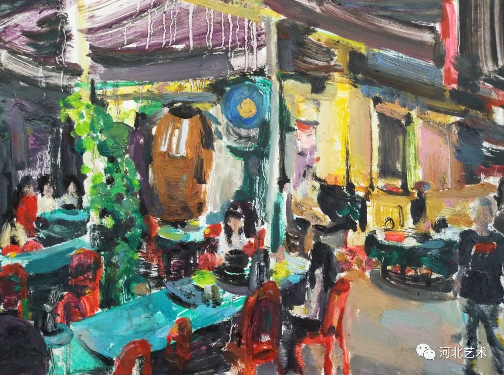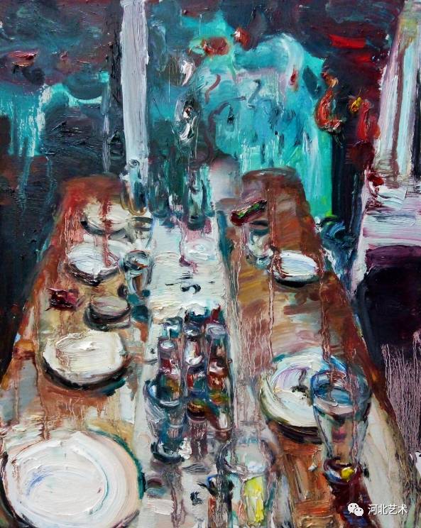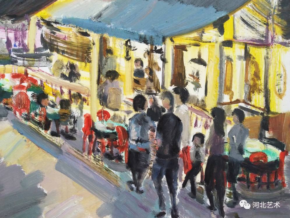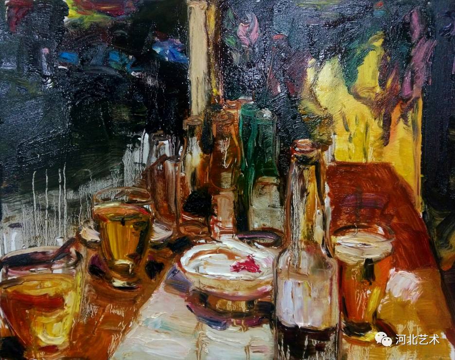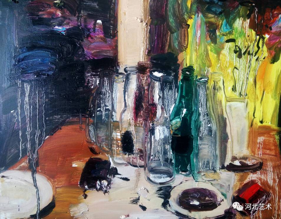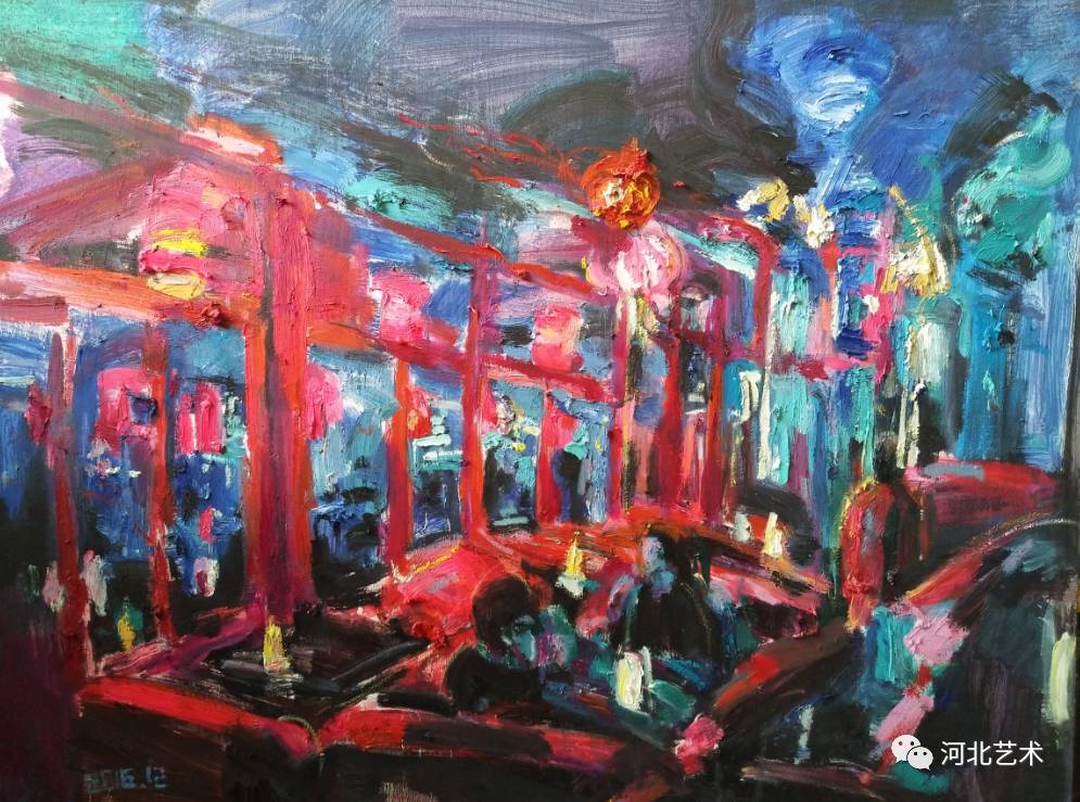 我觉得画画的意义在于画者内心的独立表现。油画是一个纯粹而又色彩斑斓的世界,独立的内心在这个世界里可以安逸,可以放松甚至可以发泄。我喜欢用粘稠的色彩和调和的松节油按照自己想要的状态去挥洒,营造一种气氛感,特别是晚上的气氛。 我更喜欢夜晚的灯光穿过 透明物体折射出的微妙色彩 ,或者多种灯光的反复折射,在稀释的油脂中加入 光的颜色 , 在漆黑的夜里像个跳动的精灵 ,给这个夜罩上了神秘的面纱。