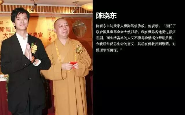 9/24陈晓东自幼受家人熏陶笃信佛教,他表示:“担任了联合国儿童基金会大使以后,我在世界各地见过很多悲剧,而生活富裕的人又不懂得珍惜福分帮助贫困,令我经常反思生命的意义,其后在佛教找到慰藉,对佛理领悟更深。”