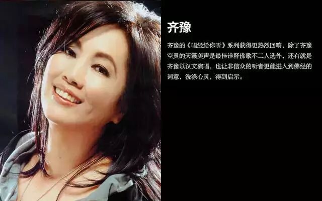14/24齐豫的《唱经给你听》系列获得更热烈回响,除了齐豫空灵的天籁美声是最佳诠释佛歌不二人选外,还有就是齐豫以汉文演唱,也让非信众的听者更能进入到佛经的词意,洗涤心灵,得到启示。