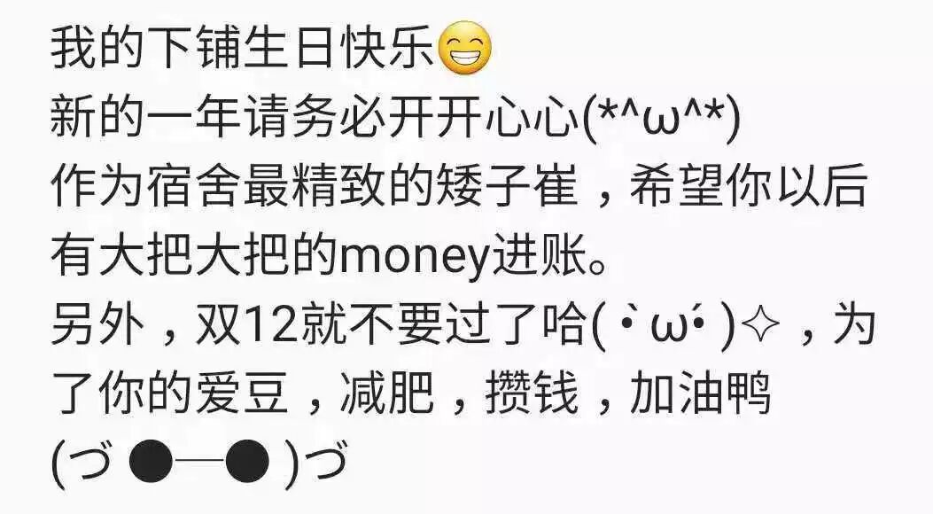 崔崔同学,2开头了啊~ 说起来还是你把我拉进这个寝室的,然后志(zhui)同(xing)道(lu)合(shang),真是缘分呐(哈特) 你这个看起来大胆实际上连和段宜恩说话都不敢的怂逼,祝你下次见到段宜恩能进步一点问个好哈哈哈 已经愉快的一起生活了一年半,还有剩下的两年半,时间真的很快,接下来的日子继续欢声笑语不断制造黑历史共同度过吧-.- 生日快乐呀!!!