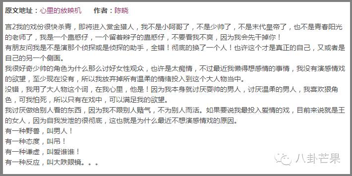但你知道中二boy心里是怎么想的吗?后来他接到了电视剧《赏金猎人》,饰演一个性格彪悍的纨绔子弟白少群,虽然是只是男三号,但陈晓很兴奋,觉得是大人物!于是写了一篇博客: