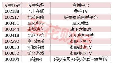 在A股市场,除了昆仑万维,目前拥有自有直播平台的上市公司有:巴士在线、恺英网络、乐视网、暴风科技、宋城演艺、奥飞娱乐、浙报传媒、游久游戏等。