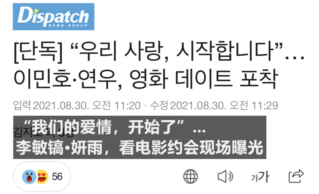 今天一大早,D社久发表了一篇题为《“我们的爱情,开始了”...李敏镐·妍雨,看电影约会现场曝光》的独家报道,说李敏镐和爱豆出身的妍雨已经在一起五个月了。