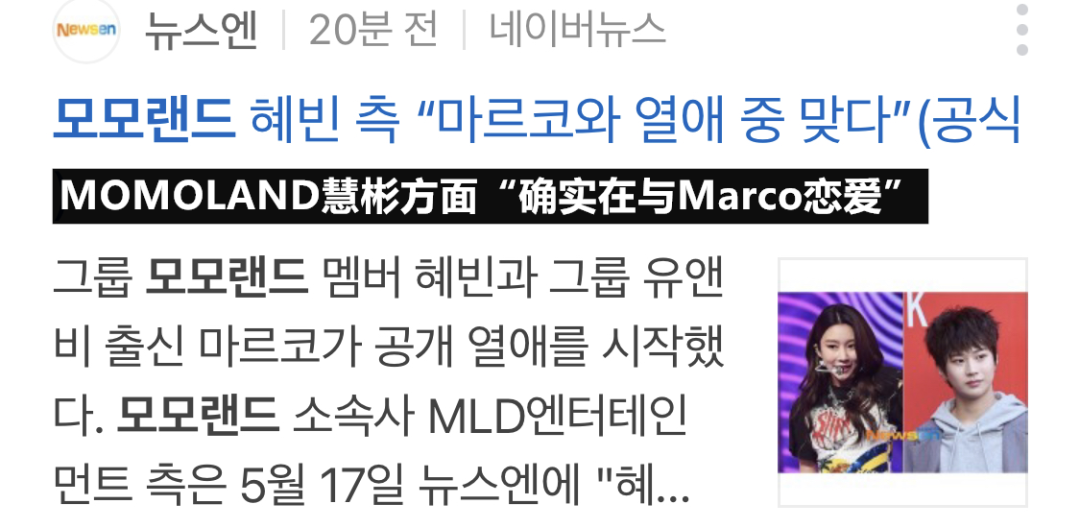第四个,韩国网友曝光了MOMOLAND慧彬和Marco的恋情!报出来之后,男生还在粉丝群里拼命否认。