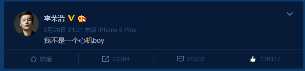 后来上了《我是歌手》踢馆,没有成功,但这抵挡不了他火遍全国的步伐。他的歌一遍遍被提及,甚至连陈奕迅等大咖都是他的歌迷。他的歌的确很有特色,几乎一听就贴上浓浓的李荣浩标签。然而,有人说他是心机 boy ,虽然他发过微博反驳过,但他在大家心中还是个心机 boy ▼
