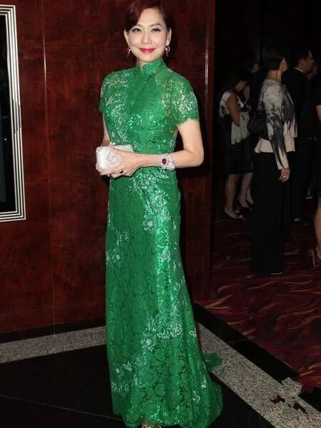 虽然开始慢慢年龄越来越大,但是穿搭还是非常时尚没得说,下图照片中,邝美云穿了一件墨绿色蕾丝性感紧身长裙看着非常优雅的颜色加上温柔的风格,两者的合二为一看着就非常的完美。