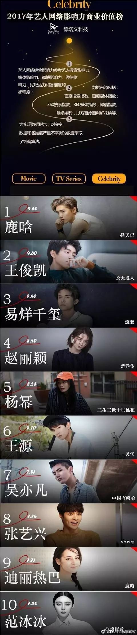 杨幂因为《三生三世十里桃花》名列第四,李易峰因为《心理罪》名列第十一,杨洋因为《武动乾坤》名列第十二,胡一天因为《小美好》名列第十三,陈伟霆因为《橙红年代》名列第十五。