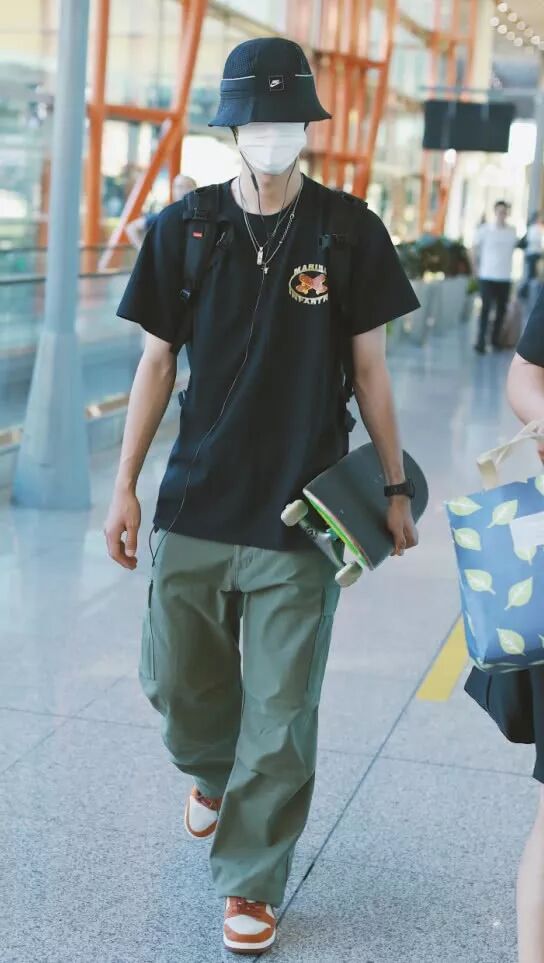王一博很喜欢这种休闲风的装扮,这次的穿搭也是如此,一件黑色T恤+军绿色的工装裤+AJ,尽显青春与个性。他还戴着一顶黑色渔夫帽,增添了几分趣味,展现出高挑的身材。