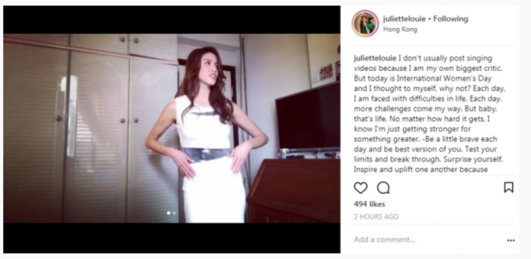 她以英文留言表示不要做一只视觉动物,要有内涵,写道:“谨记你的梦想,然后努力去圆梦,如果你没有放弃就会看到不一样的事情。忠于自己,可以吸取灵感,但最重要是做自己唯一的灵感来源。我敬佩这世上所有坚强而勇敢的女士们。国际妇女节快乐!”