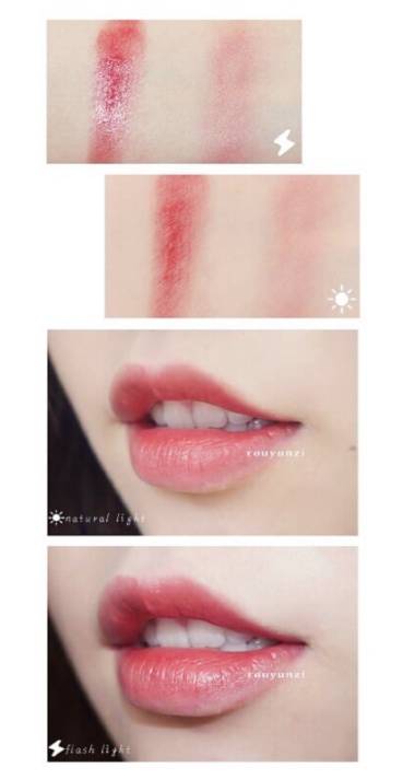 同理,搭配这样的眼妆,其唇色显然也要比第一款更加柔美一些,整体也在向橘色靠拢,饱和度依旧非常好,也是粉嘟嘟的感觉~
