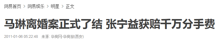 2011年,马琳以支付千万“分手费”为代价与张宁益协议离婚,这场历时两年、开庭六次的“离婚大战”终于落下帷幕。张宁益经纪人徐海燕承认传闻中高达千万的财产分配。
